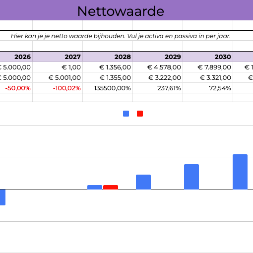 Naast dat je de groei van je spaargeld en investeringen door het jaar heen wilt bijhouden, wil je natuurlijk ook weten hoe je vermogen door de jaren heen groeit. Daarom kun je in de Flow planner de groei van je nettowaarde per jaar bijhouden. Zo houd je je vermogensgroei bij en weet je of je on track bent voor het behalen van je grootste financiële doelen.