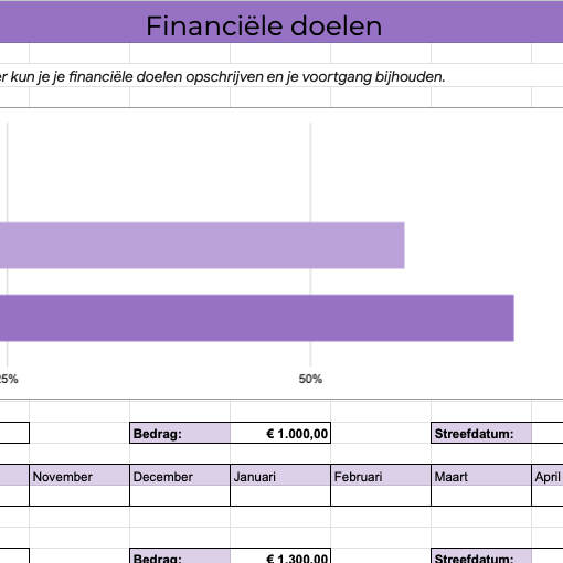 In de Flow planner kun je ook je financiële doelen en de voortgang daarvan bijhouden. Je geeft aan welke bedragen je opzij zet, en krijg een handig overzicht met je voortgang en hoeveel je nog moet sparen.