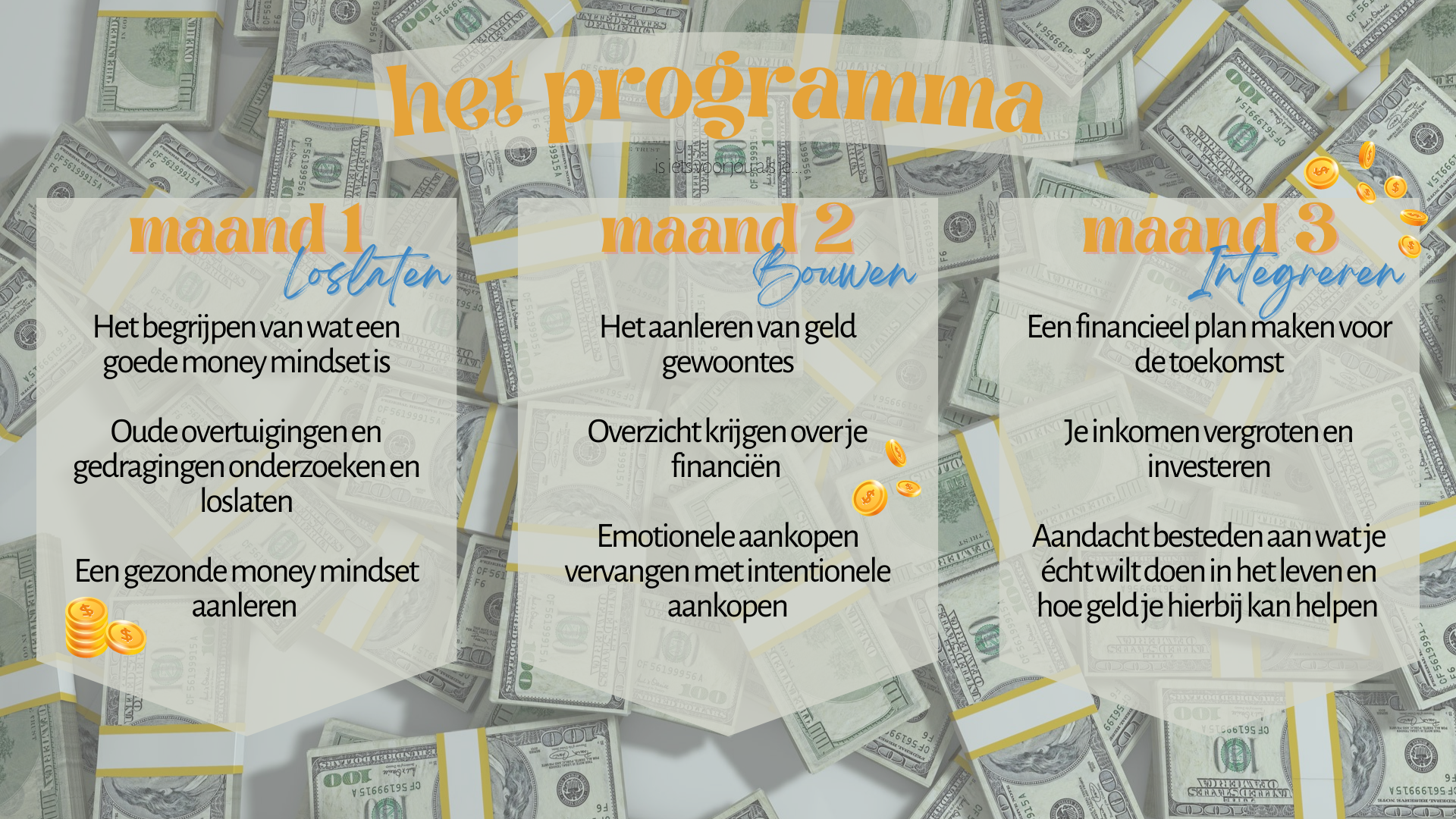 En daarom heb ik Op je Money ontwikkeld. Tijdens dit intensieve programma van 12 weken leer je goed te worden met geld. Je krijgt overzicht op je geldzaken, verbetert je money mindset en je geld gewoontes, zegt vaarwel tegen het doen van emotionele aankopen en leert investeren en een financieel plan opstellen voor de toekomst.